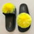 Witzige Sommerschlappe aus schwarzem Kunststoff. Auf dem breiten Riemen gelbe Pompons aus Textil.